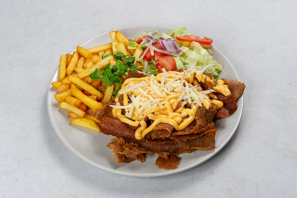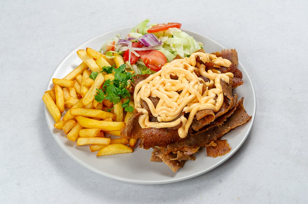Mięso pieczone 150 g, frytki, ser feta lub żółty, surówka i sos