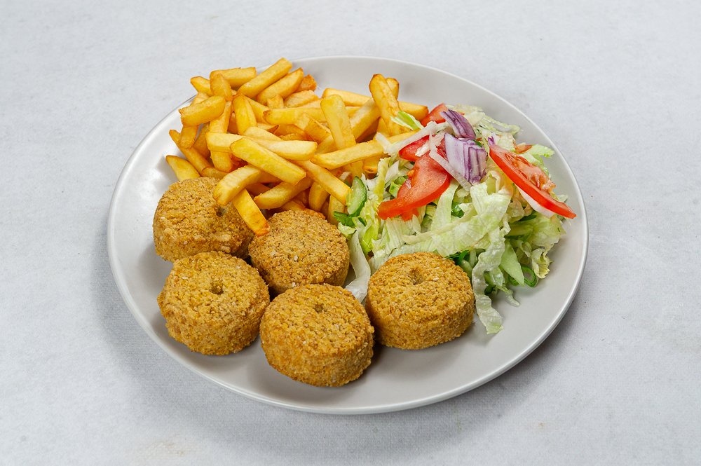 Frytki, falafel 4 szt., surówka, sos do wyboru