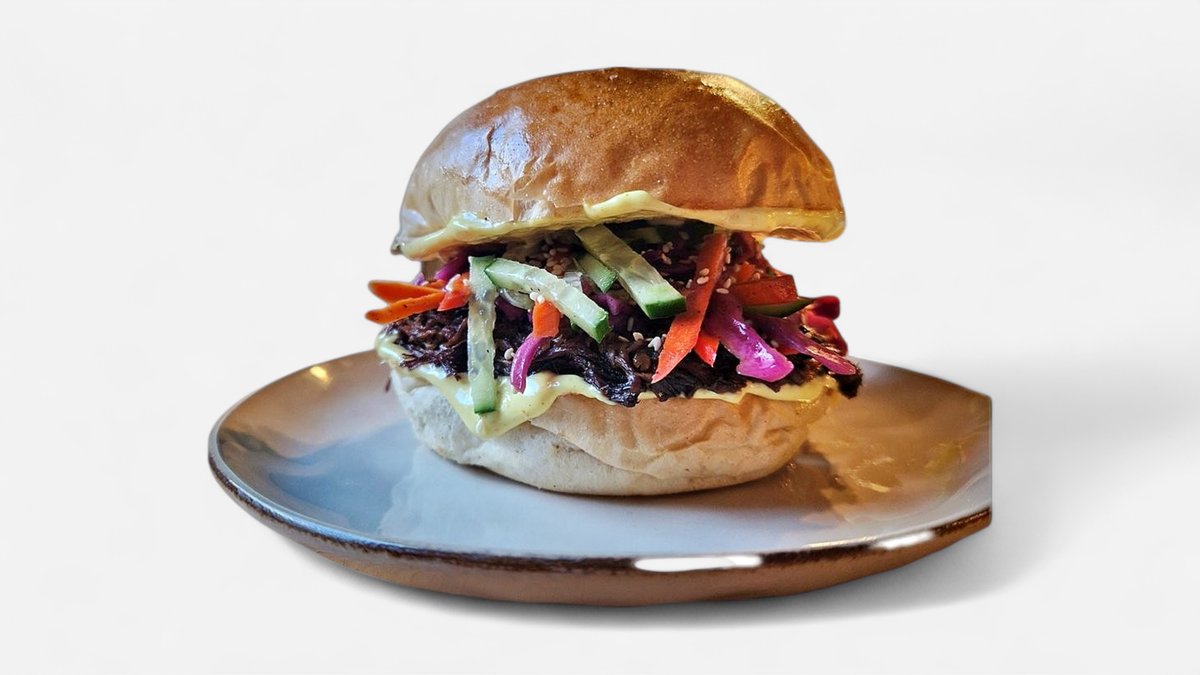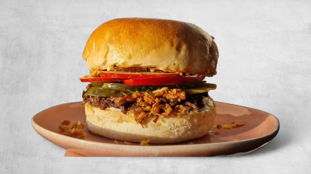 2 x kanapka w wiejskim chlebie: szarpane mięso wołowe, cheddar, kiszona kapusta, karmelizowana czerwona cebula, sos amerykański, ogórek kiszony