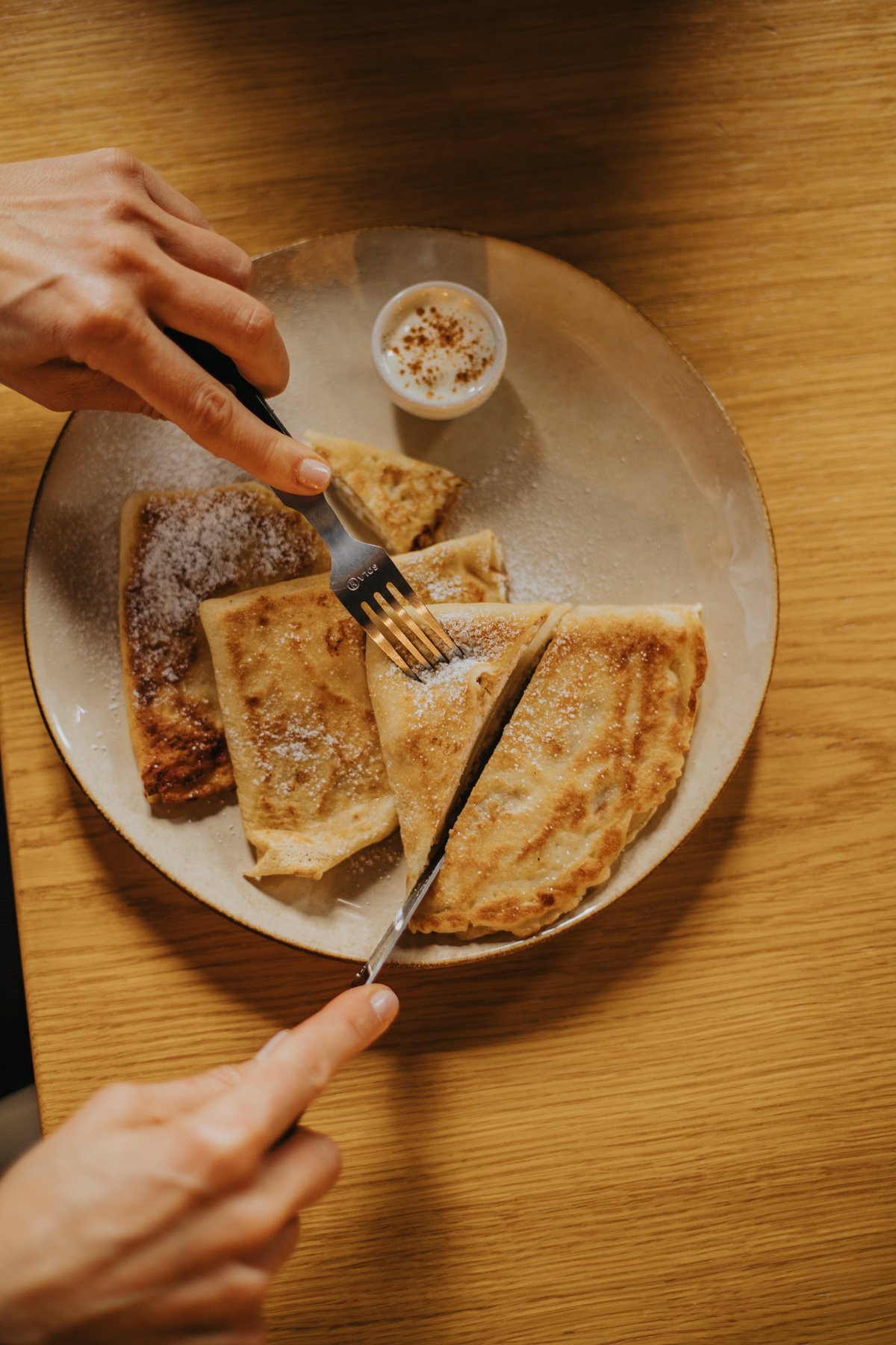 Naleśniki z twarogiem, śmietaną, cynamonem i cukrem pudrem 3 szt
