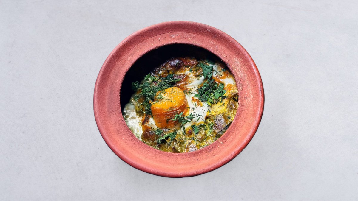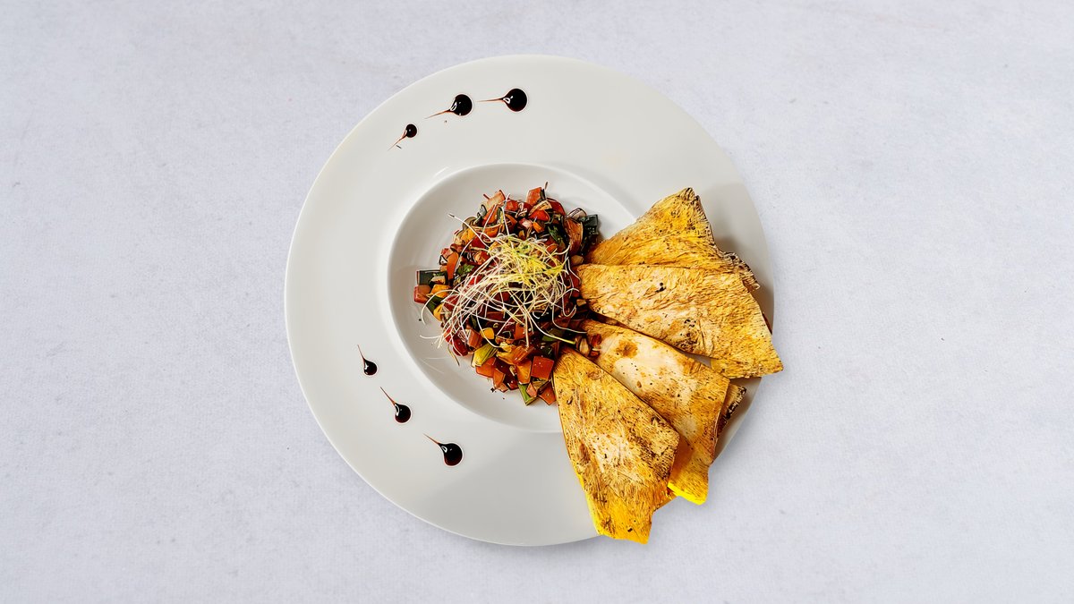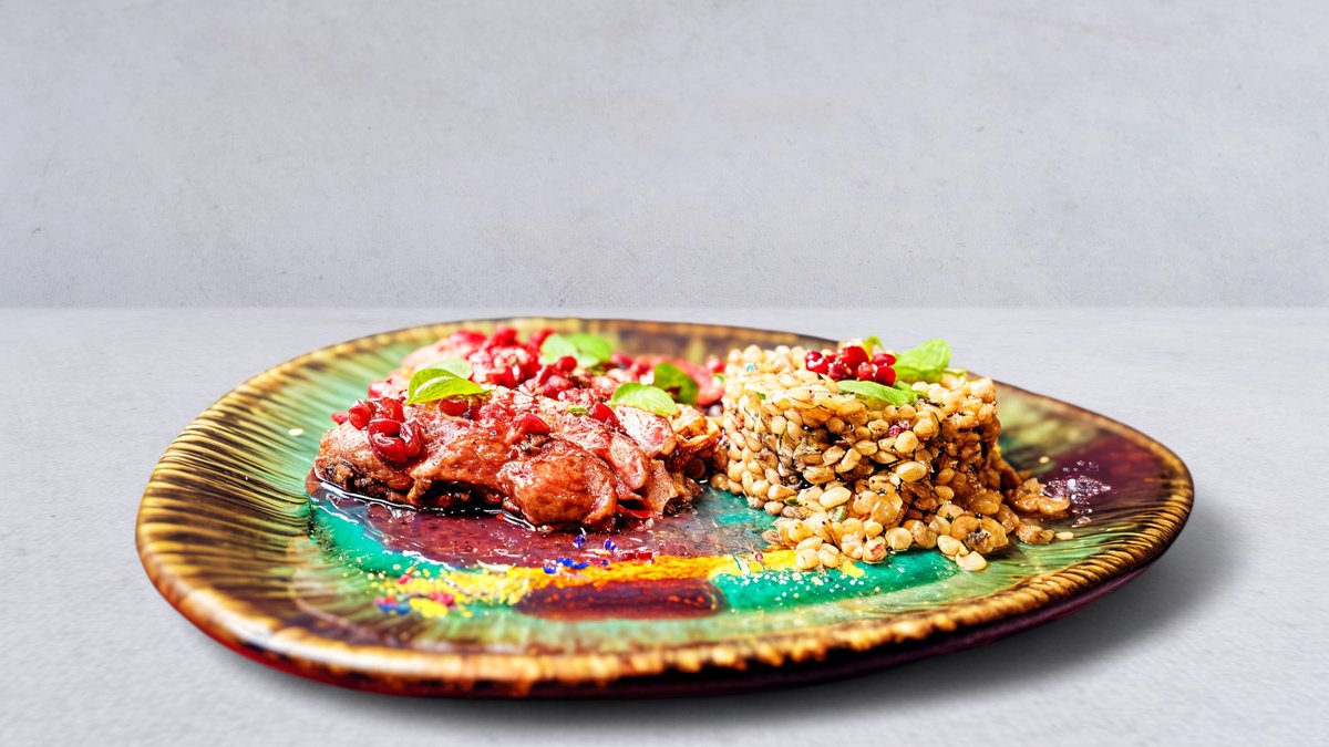 Filet z kaczki z pigwą, podawany z kotlecikami z bakłażana z sosem naszarap (sos na bazie owoców granatu z chilli)