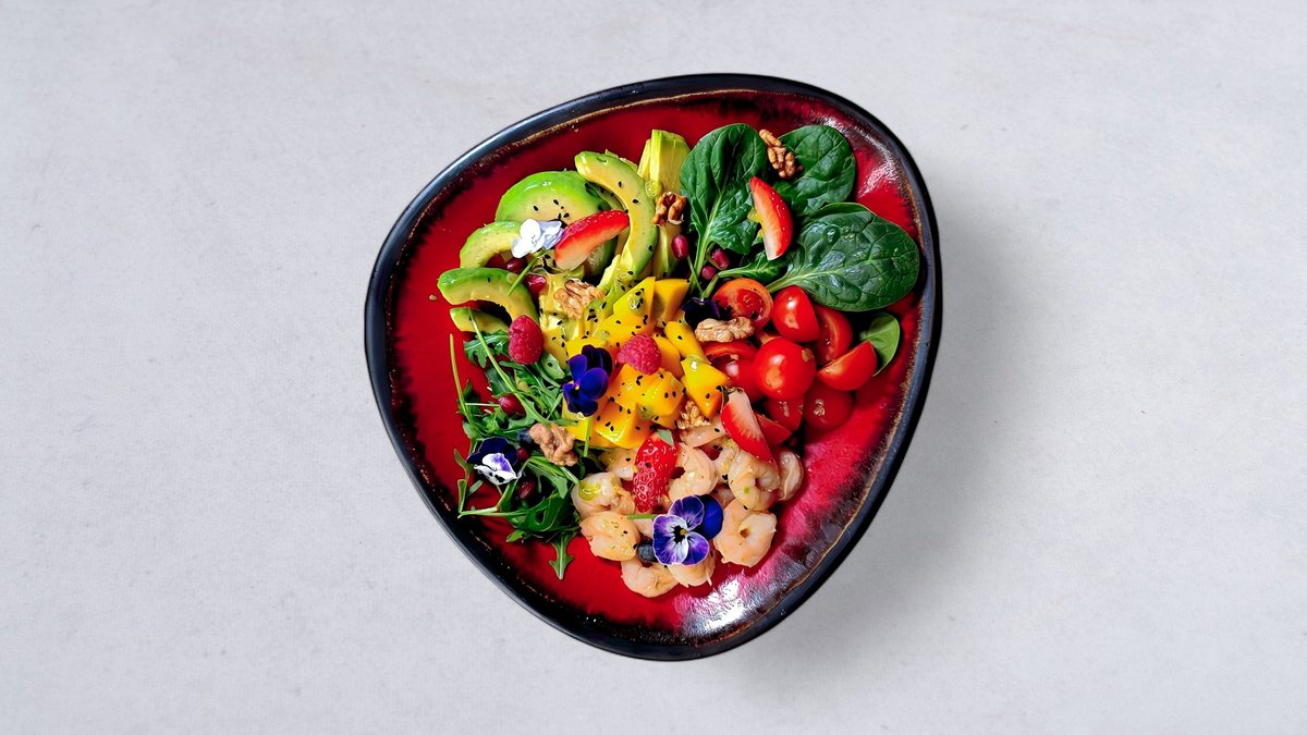 250g. Krewetki, awokado, swieży szpinak, rukola, mango, pomidorki koktajlowe z sosie sojowym