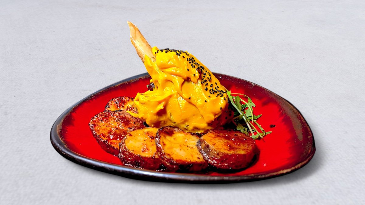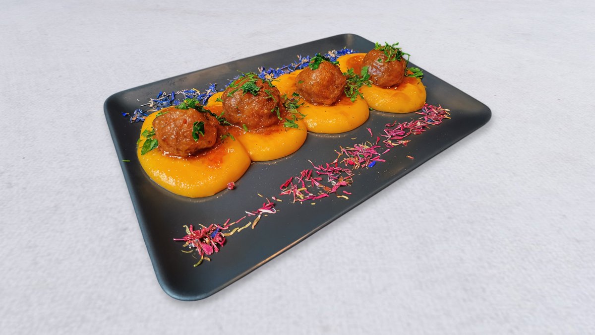 Pulpeciki z baraniny z figą i orzechami w sosie brzoskwiniowym na ostro z fioletową bazylią, serwowane z puree z dyni i ziemniaków