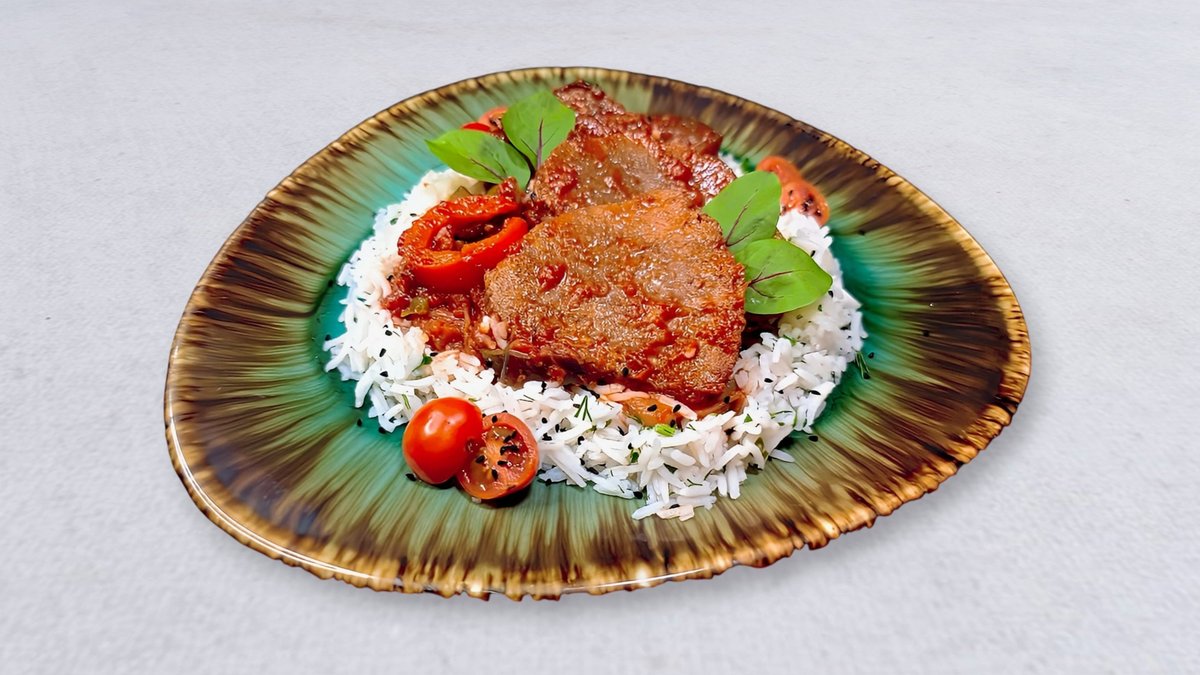 W sosie z bakłażana i pomidorów podawane z ryżem białym