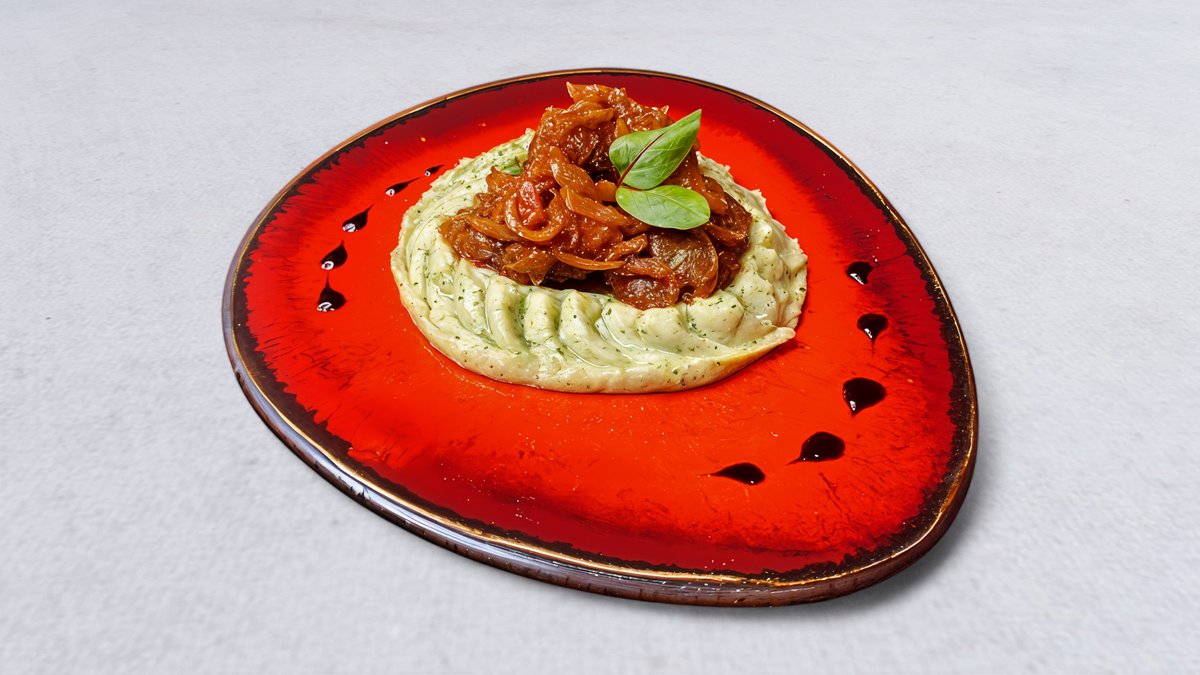 Duszone w sosie pomidorowo-miętowym podawane z puree ziemniaczanym