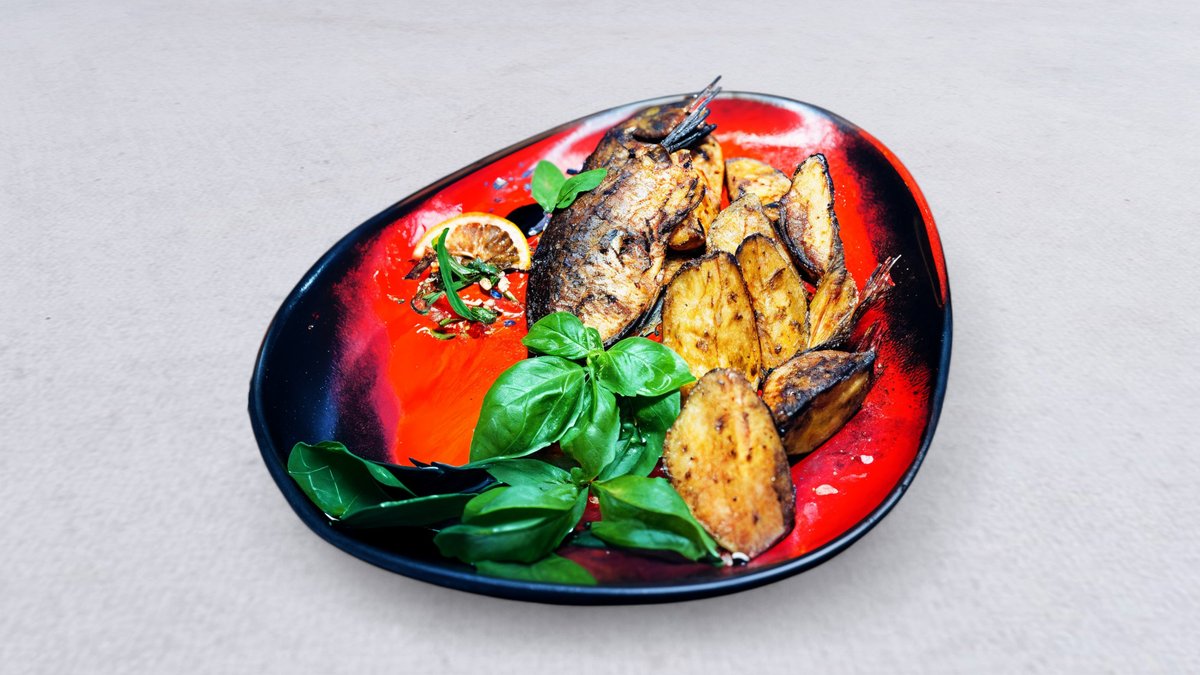 Dorada pieczona z cytryną podawana z ziemniakami pieczonymi