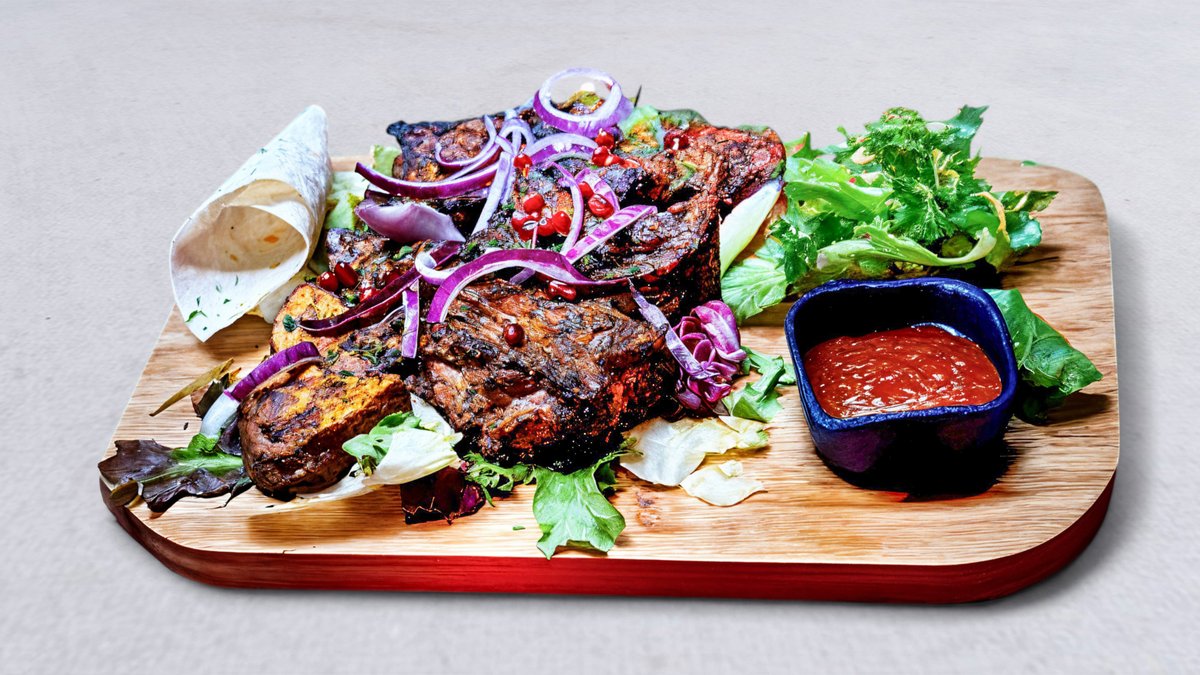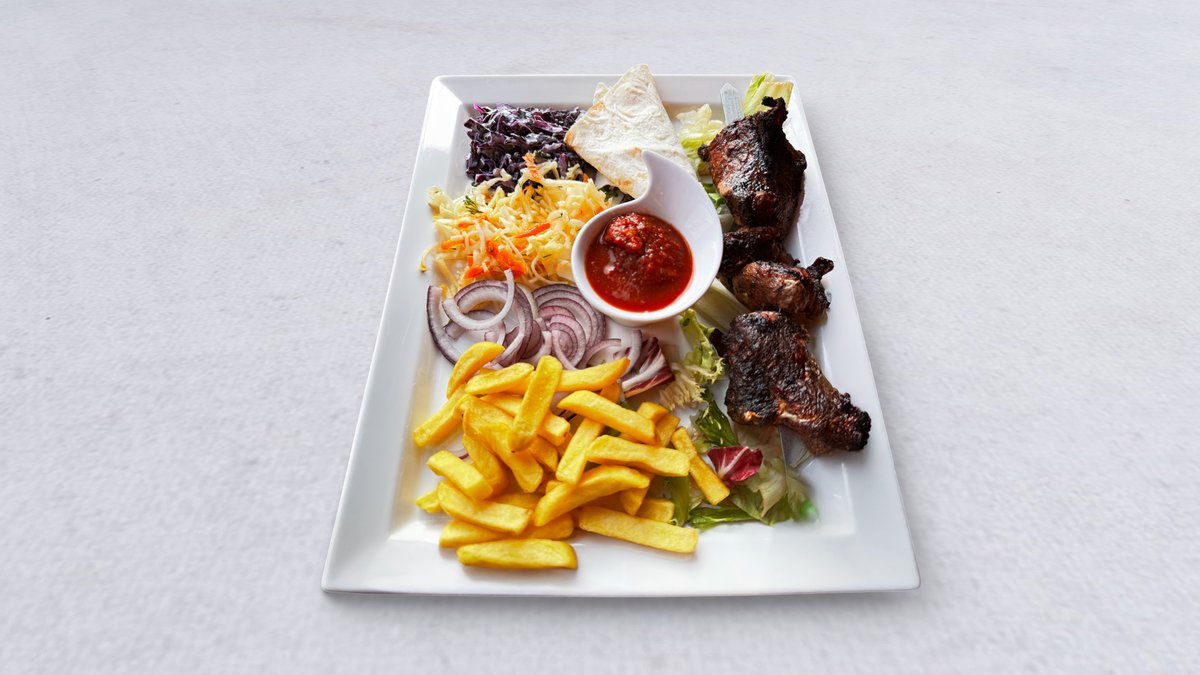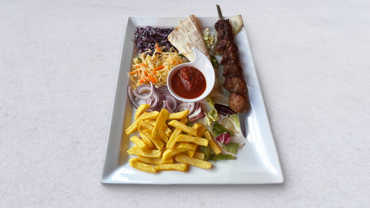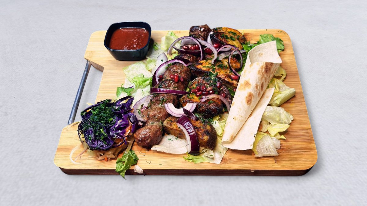 Mix mięs kebab ormiański z kurczaka, kebab ormiański z wołowiny, khorowac (marynowane żebro wieprzowe), ziemniaki pieczone, surówka i sos pomidorowy oraz adzga (ostry)