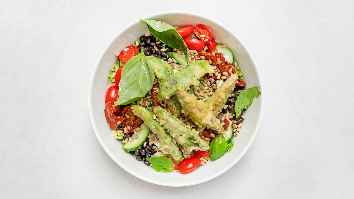 Awokado w cieście, mieszanka sałat, czarna fasola, pomidorki koktajlowe, ogórek zielony, suszone pomidory, prażony słonecznik, sos vinegrette na bazie białego wina