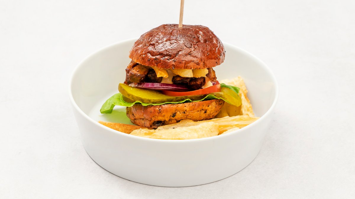 Burger wołowy, grillowana pancetta, sałata rzymska, ogórek konserwowy pomidor, czerwona cebula cheddar