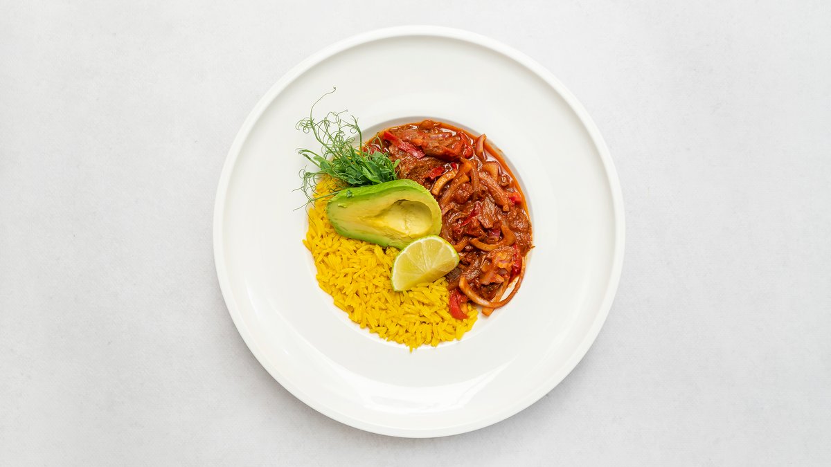 Wolno gotowana szarpana wołowina, salsa z kolorowej papryki, ryż z szafranem, awokado, limonka