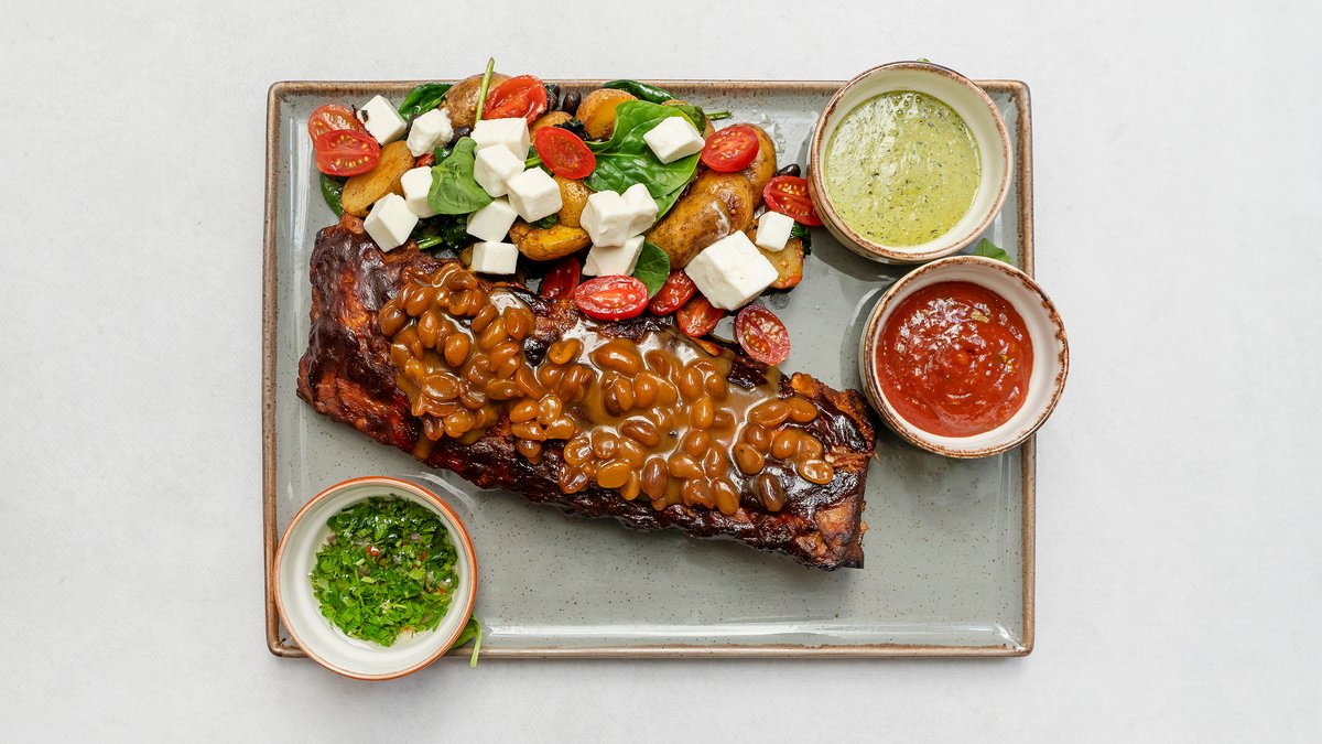 Żeberka wieprzowe z suszonymi śliwkami z papryką chipotle, ziemniaczki baby z czarną fasolą papryką, szpinakiem i fetą, karmelizowane orzechy, do żeberek podajemy trzy sosy: majonezowe pesto bazyliowe, kolendrowy sos mango-jalapeño, chimichurri