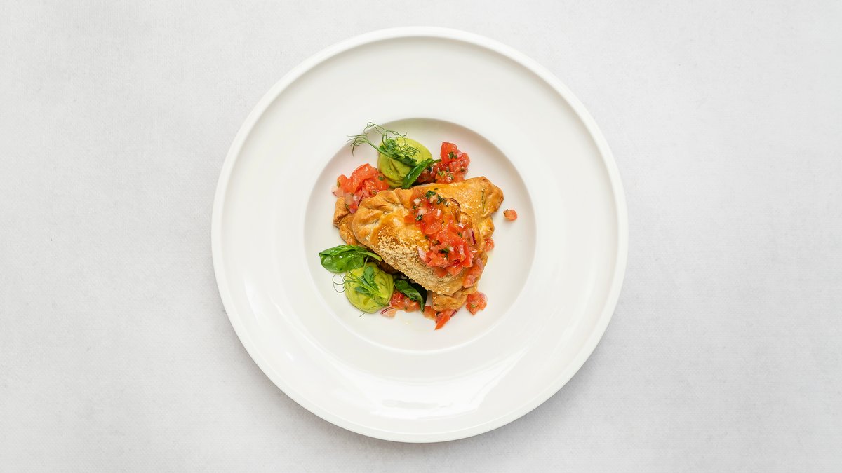 Pierożki z ciasta półfrancuskiego z duszonymi pieczarkami i truflą, chimichurri, puree z awokado, salsa pomidorowa