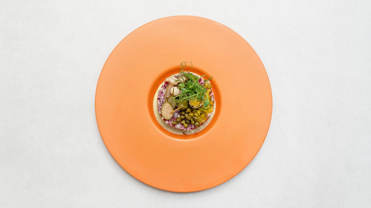 Tatar z sezonowanej wołowiny, majonez kaparowy, jajko przepiórcze, marynowane grzyby