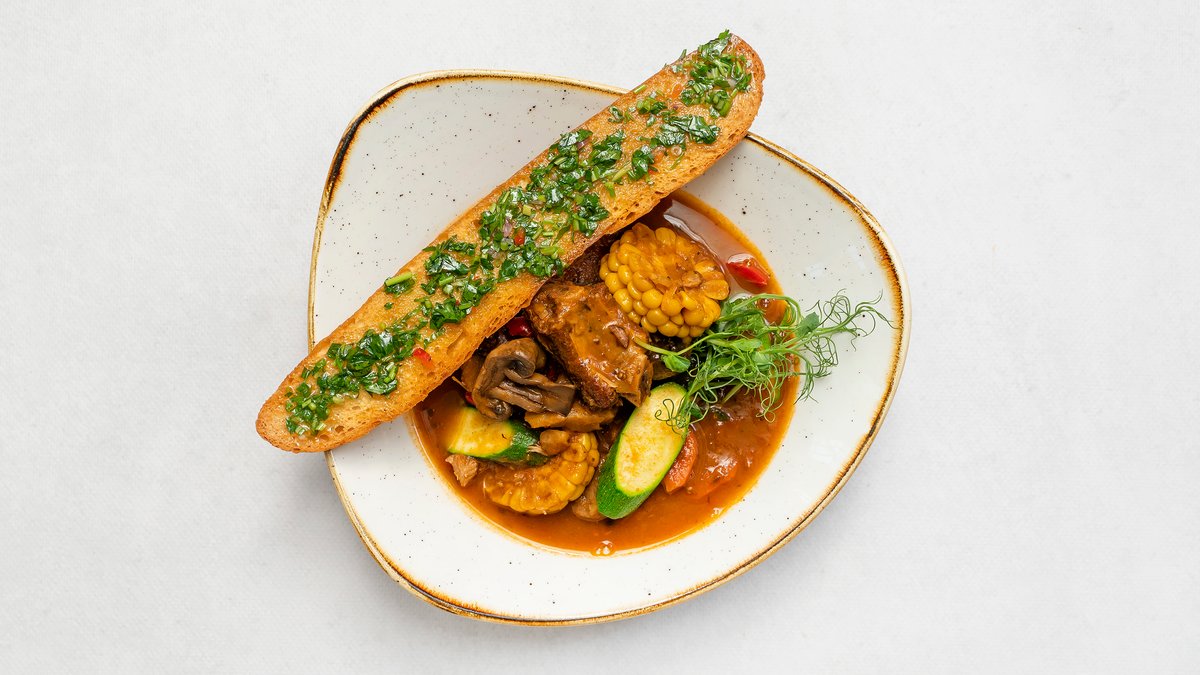 Gęsta zupa gulaszowa z warzywami i grzanką z chimichurri