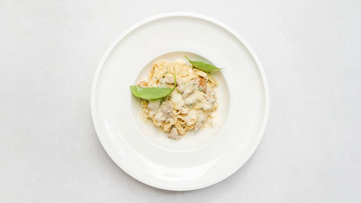 Borowik, polędwiczka wieprzowa, czosnek, śmietana, oliwa truflowa, grana padano
