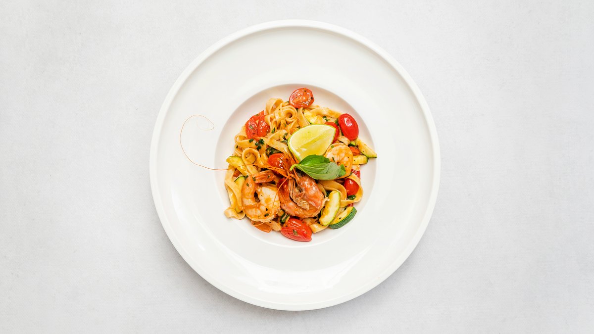 Krewetki 16/20, chilli, białe wino, cukinia, czosnek, bazylia