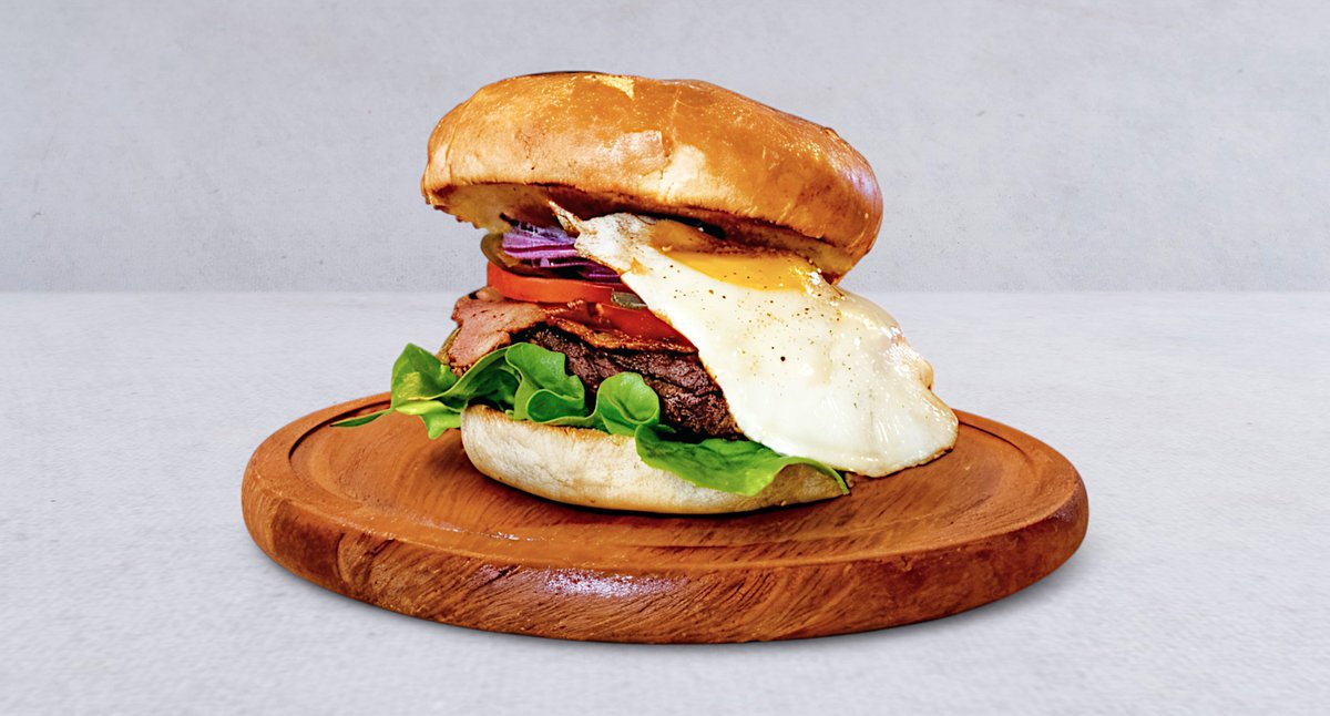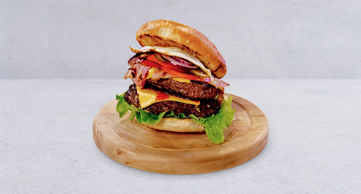 Wołowina x2, ser cheddar x2, bekon, pomidor, cebula, ogórek kiszony, jajko sadzone, sałata, sos BBQ