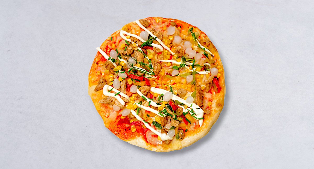 Sos BBQ, ser, kurczak, kukurydza, papryka, cebula marynowana, majonez, szczypiorek, oregano