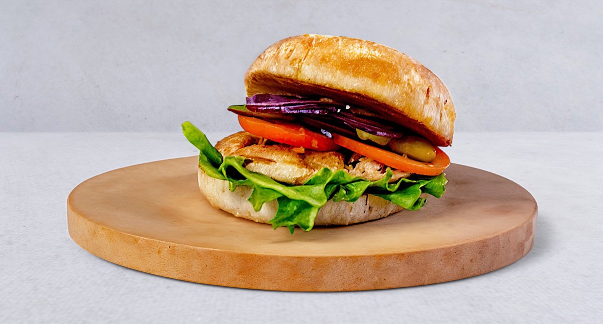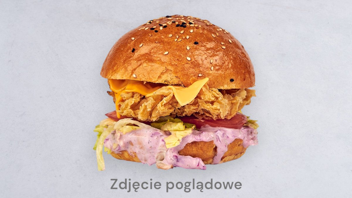 Grillowana pierś z kurczaka, cebula, pomidor, ogórek kiszony, sałata, ketchup, majonez