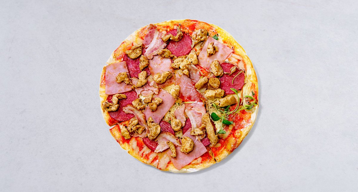Sos, ser, boczek, szynka, salami, kurczak, oregano