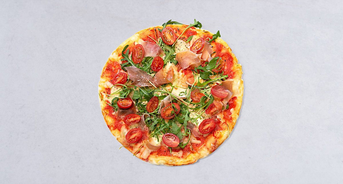 Sos, ser, rukola, szynka parmeńska, pomidorki koktajlowe, parmesan, oregano