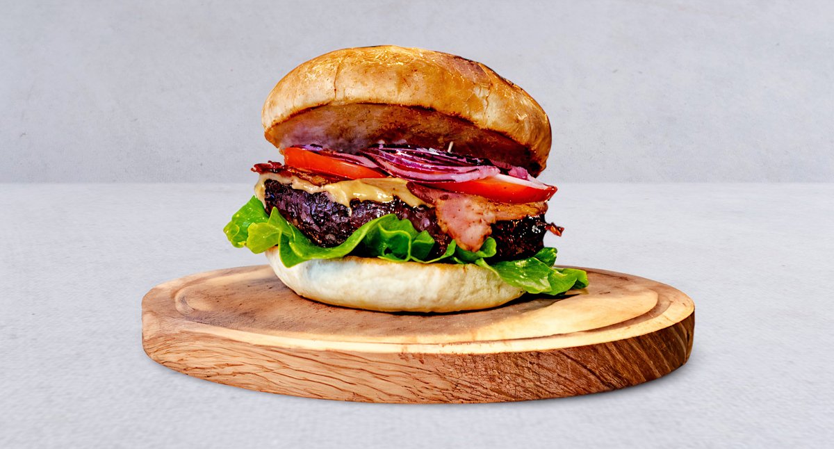 Wołowina, pomidor, cebula, masło orzechowe, bekon, sałata, sos BBQ