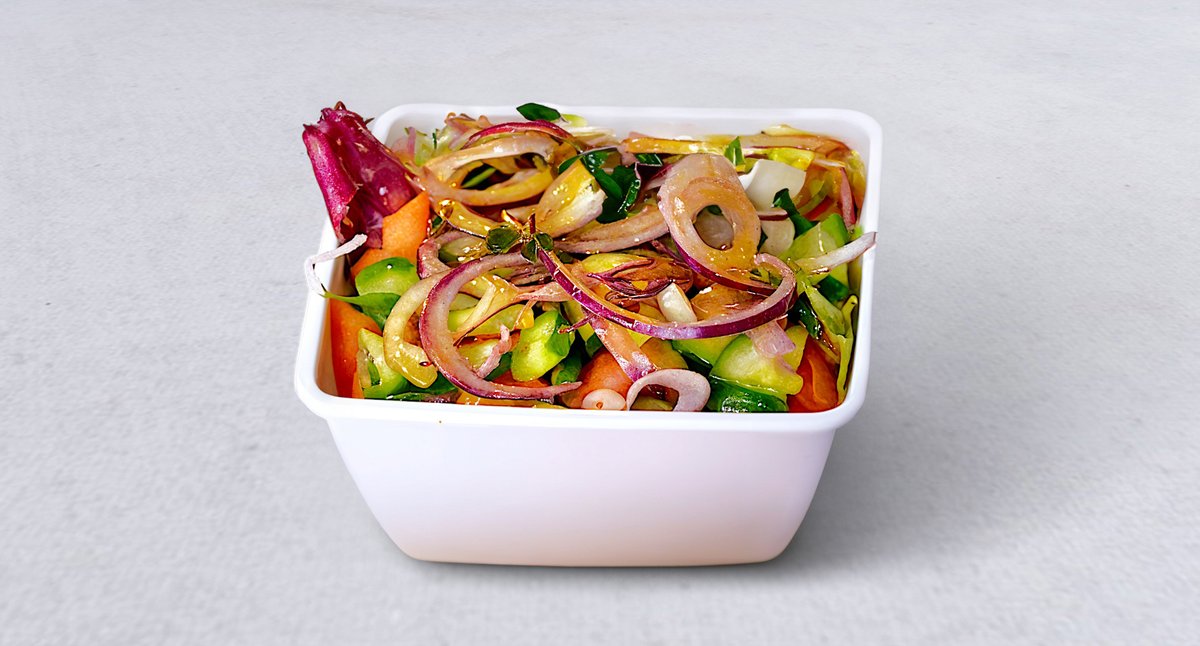 Mix sałat, grillowany kurczak, cebula, pomidor, ogórek, dresing jogurtowy
