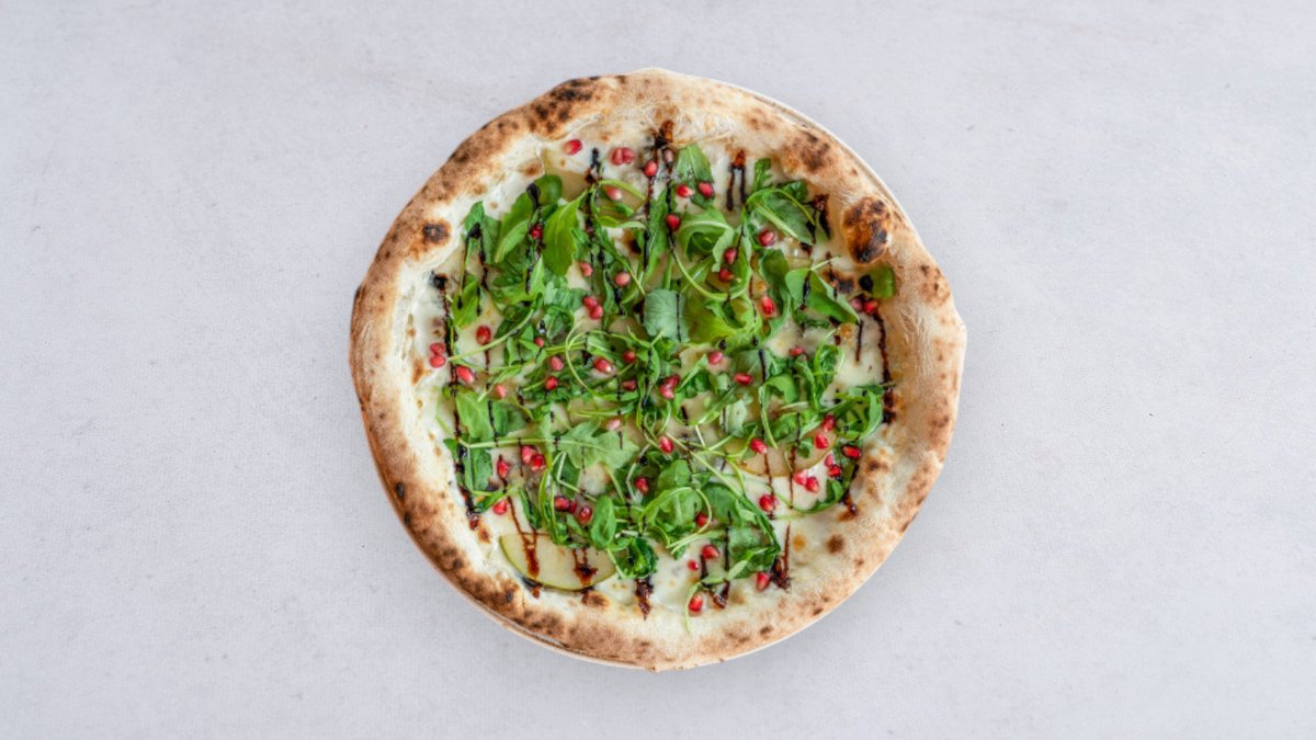 Sos śmietanowy, mozzarella fior di latte, gorgonzola DOP, gruszka, granat, rukola, krem balsamiczny