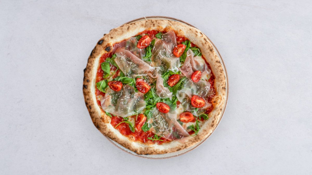 San marzano, mozzarella fior di latte, prosciutto crudo, pomidorki cherry, parmezan D.O.P, rukola