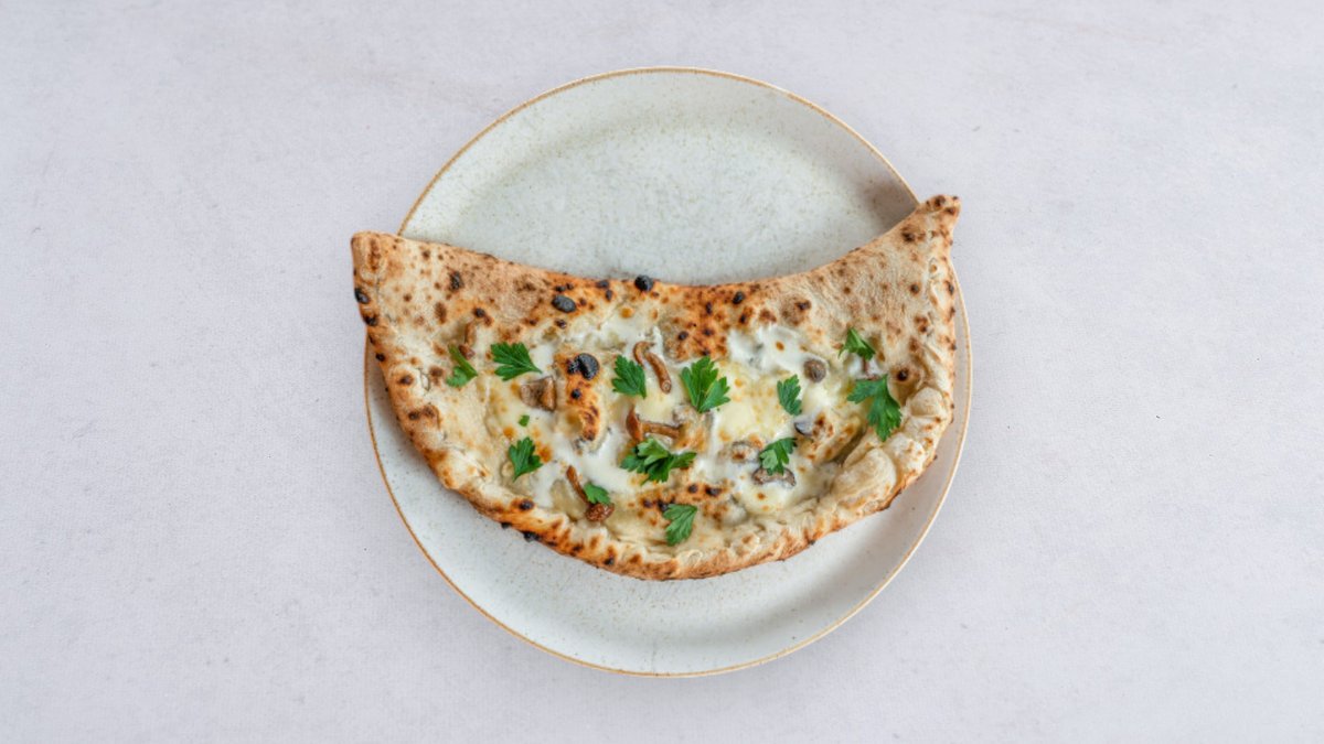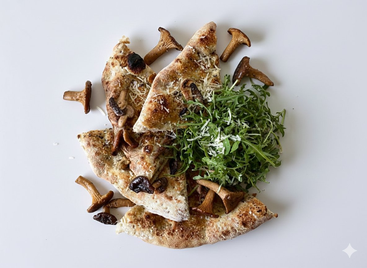 Sos śmietanowy, mozzarella fior di latte, grzyby leśne, pasta truflowa, natka pietruszki