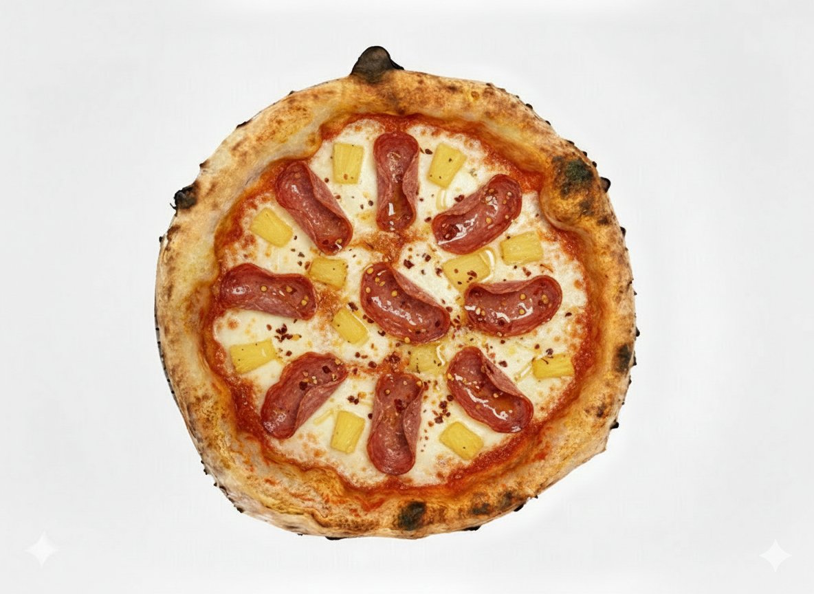 sos z włoskich pomidorów AVPN, mozzarella fior di latte, salami piccante, ananas, miód chilli, płatki chilli