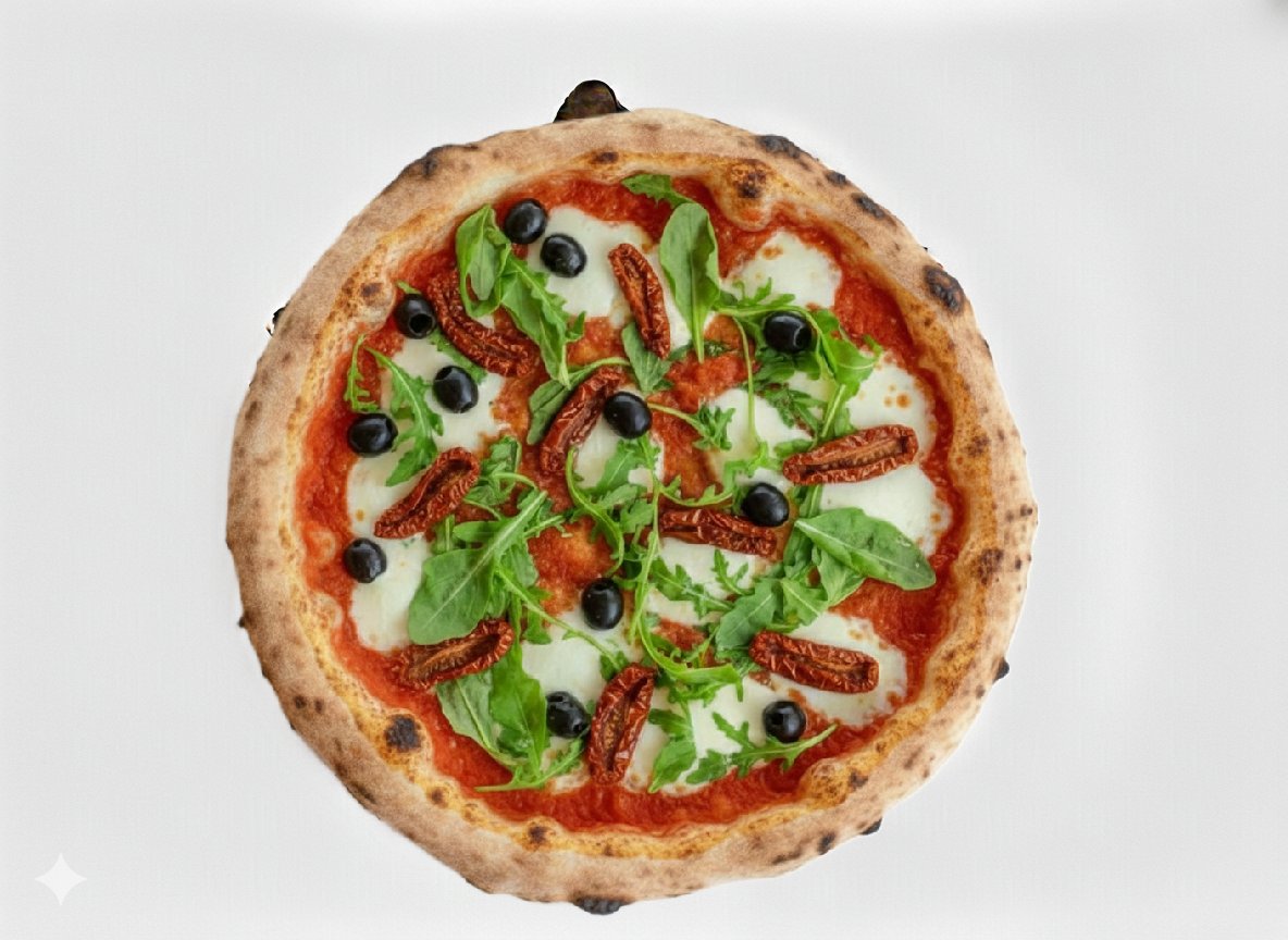 sos z włoskich pomidorów AVPN, mozzarella fior di latte, oliwki, suszone pomidory, rukola
