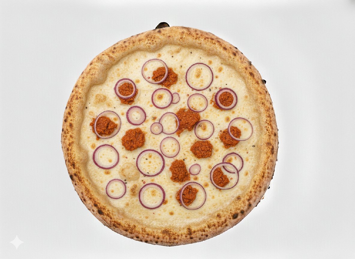 sos śmietanowy, mozzarella fior di latte, nduja, scamorza, czerwona cebula