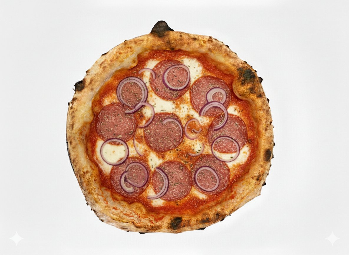San marzano, mozzarella fior di latte, salami piccante, czerwona cebula, pieczarki, parmezan D.O.P, bazylia