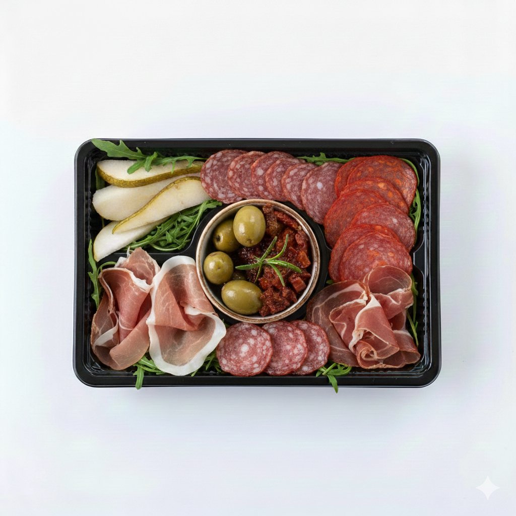 prosciutto crudo, salami piccante, łagodne salami, speck, oliwki, suszone pomidory, gruszka, rukola. pieczywo