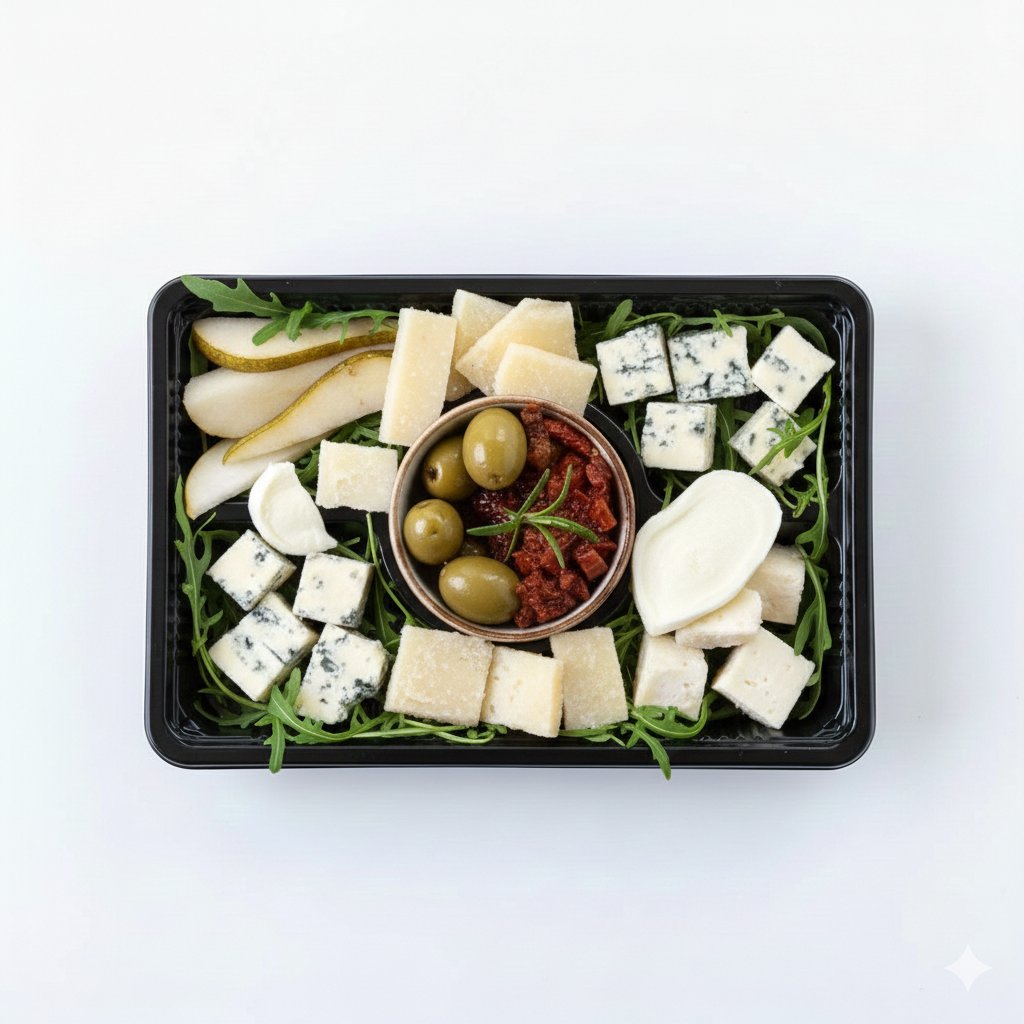 gorgonzola DOP, parmezan DOP, scamorza, mozzarella di bufala DOP, oliwki, suszone pomidory, gruszka, rukola, pieczywo