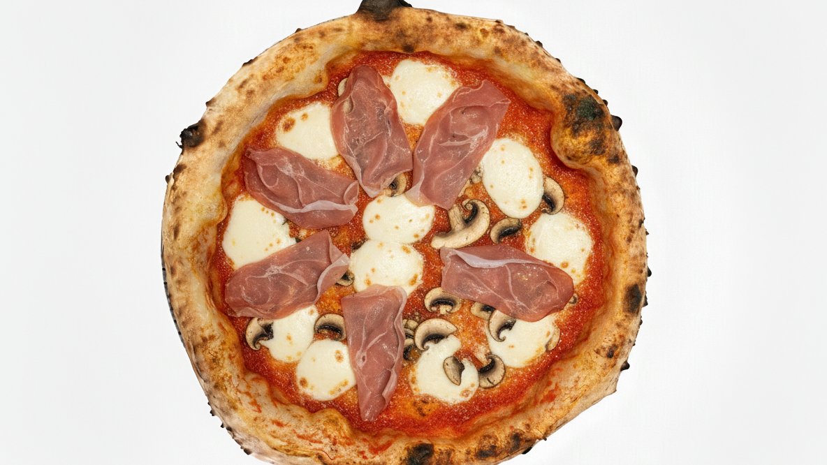 sos z pomidorów san marzano, mozzarella fior di latte, prosciutto cotto, pieczarki, bazylia