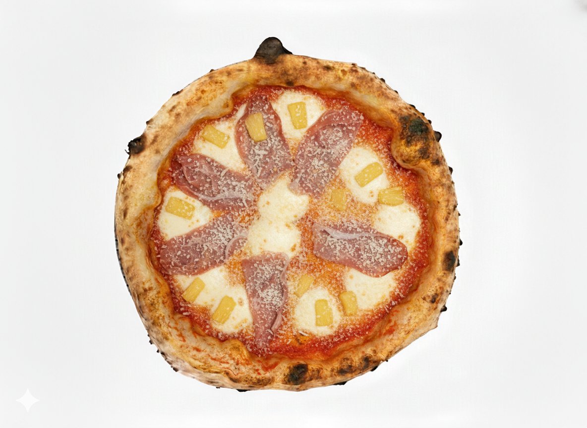 sos z pomidorów san marzano, prosciutto cotto, ananas, parmigiano reggiano D.O.P