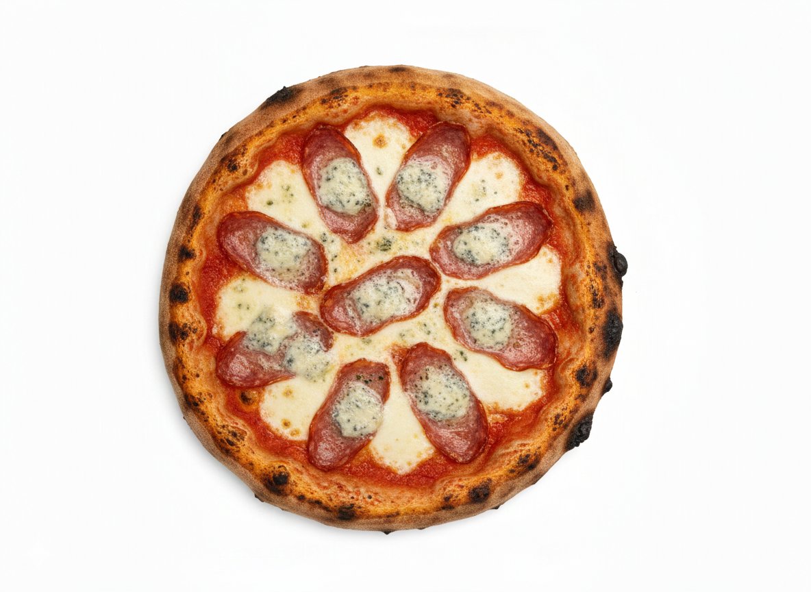 San marzano, mozzarella fior di latte, salami piccante, gorgonzola D.O.P