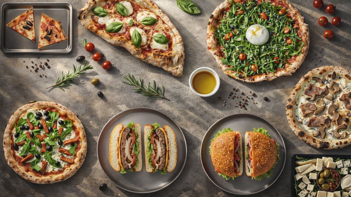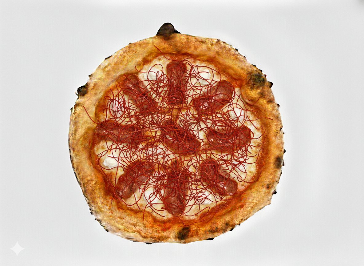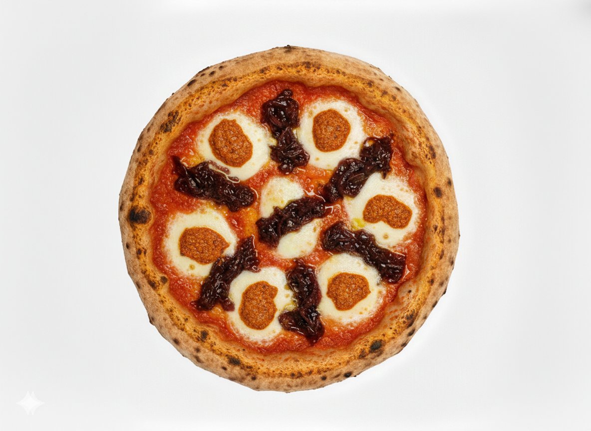 San marzano, mozzarella fior di latte, parmezan D.O.P, gorgonzola D.O.P, scamorza, mozzarella di bufala, puder z pistacji
