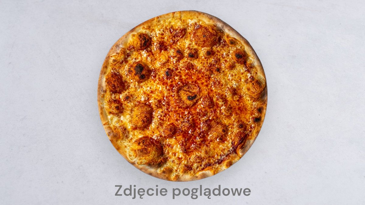 Sos czosnkowy, mozzarella, pieczarki, boczek, pieprz cayenne, mascarpone, grana padano