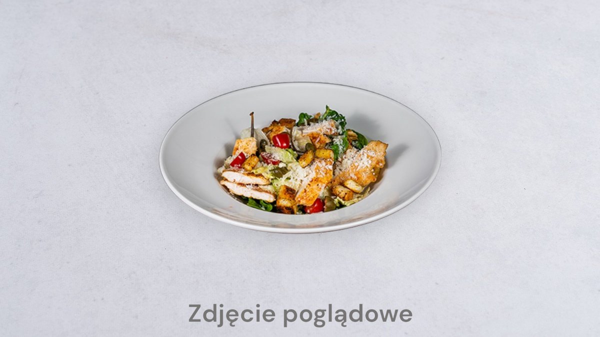 Z pomidorkami koktajlowymi, grzankami, kaparami, grana padano i mixem sałat