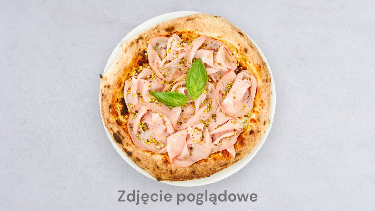 Sos z pomidorów pellatti, mozzarella fiori di latte, pesto pistacjowe, mortadella, burrata, szuszone pomidory, grana padano