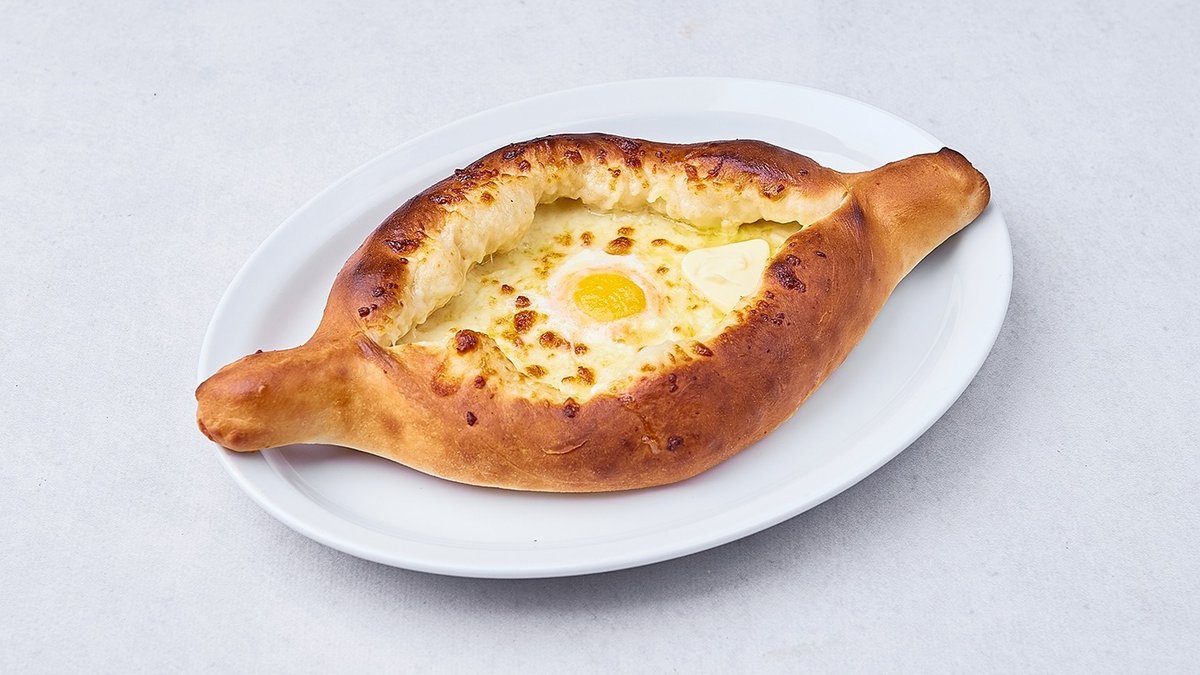 Placek z ciasta drożdżowego zapiekany z serem imeretyńskim, masłem i jajkiem