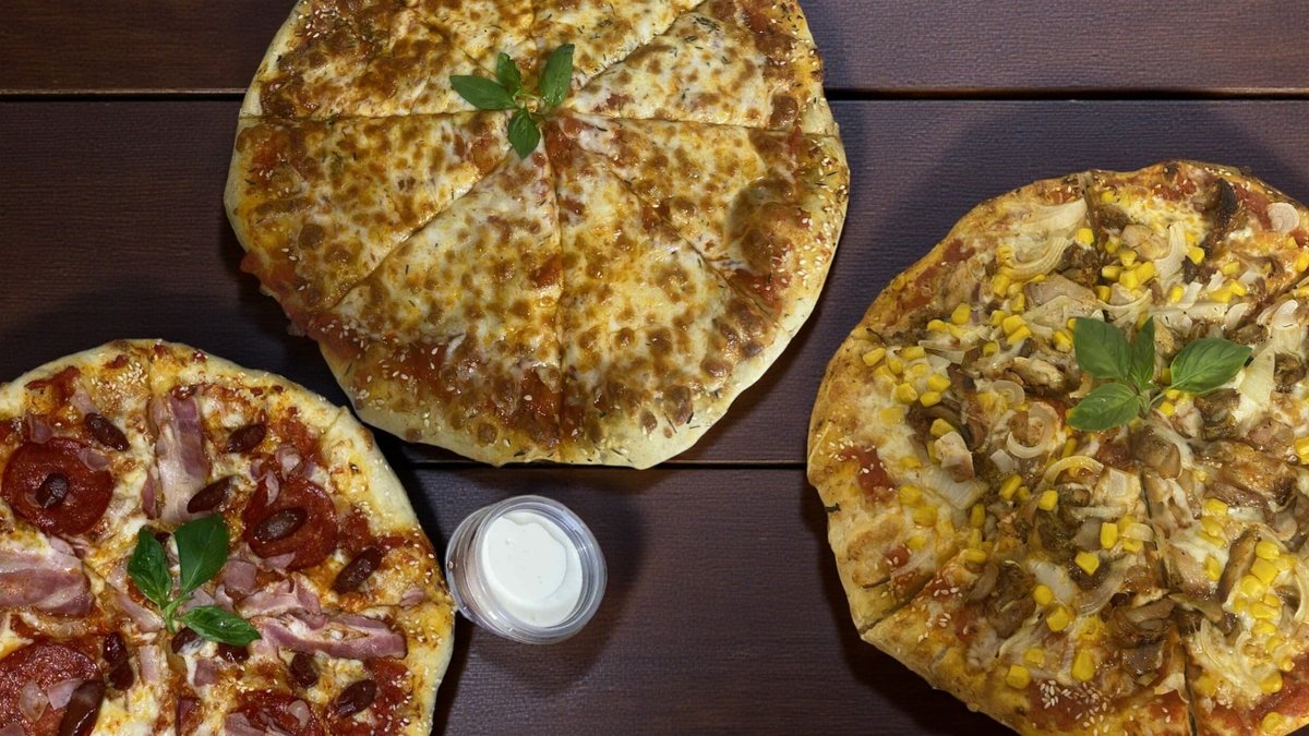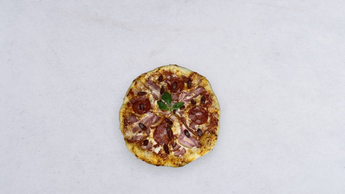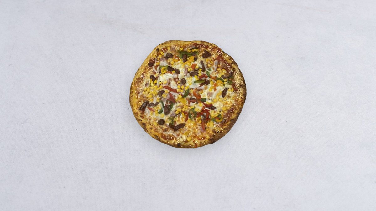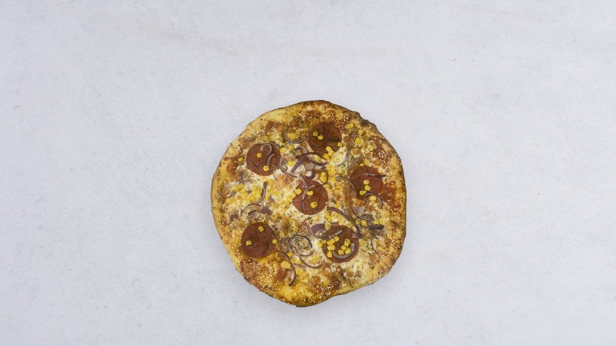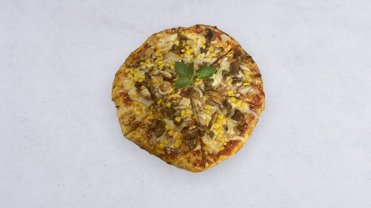 Sos, ser, kabanos, szynka, boczek, cebula biała, papryka, kukurydza