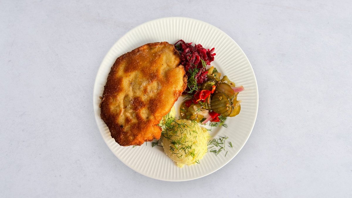 Kotlet schabowy w jajku, ziemniaki, surówka