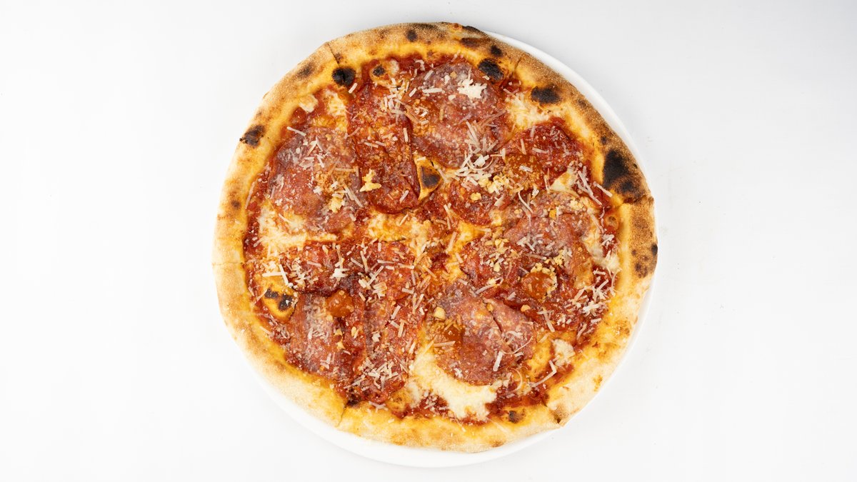 Sos z pomidorów san marzano, ser mozzarella fior di latte, salami, spianata, czosnek, parmezan, piekielna pasta paprykowa, peperoncino
