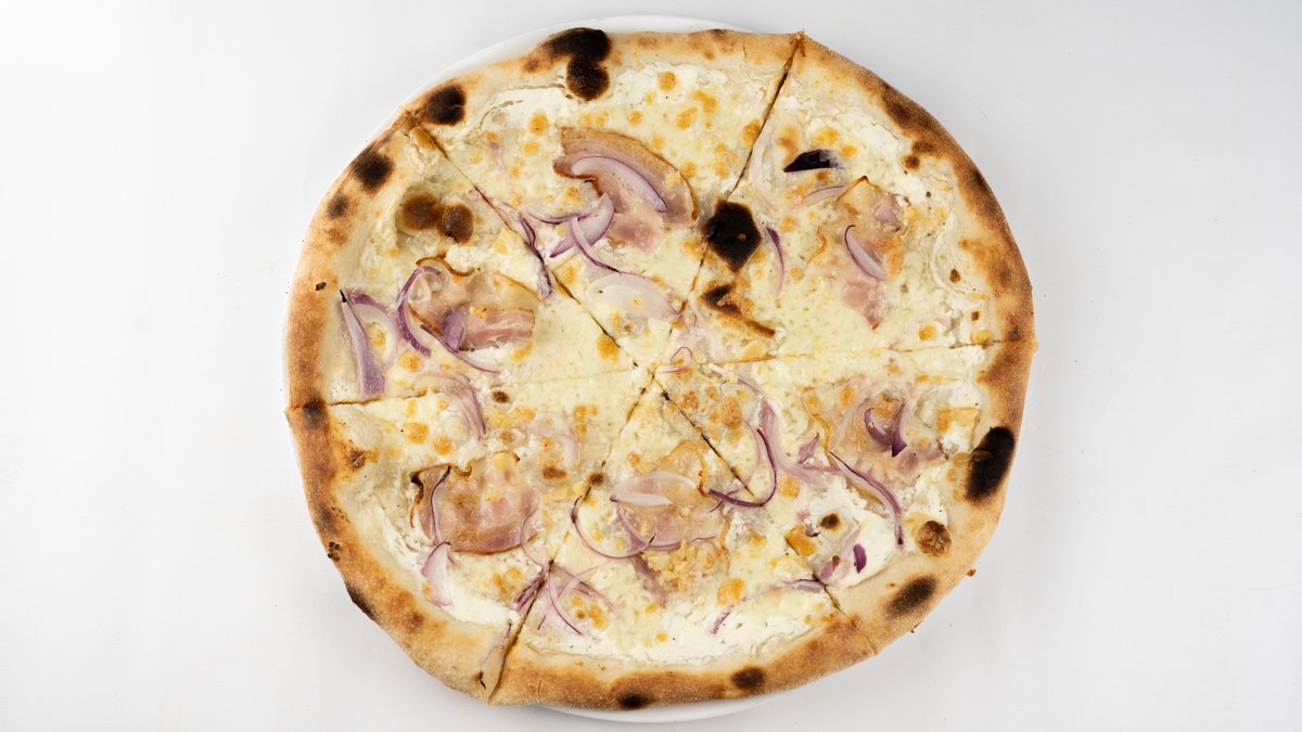 Sos śmietanowy, mozzarella fior di latte, bekon, cebula, czosnek