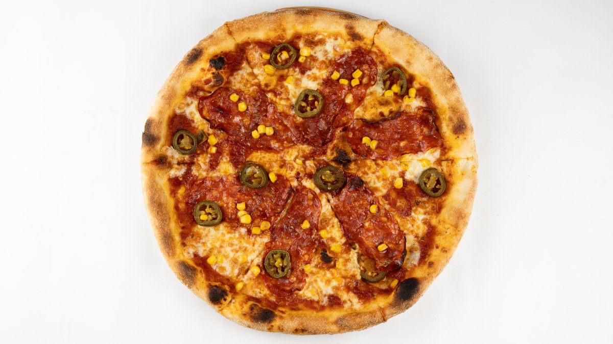 Sos z pomoidoró san marzano, mozzarella fior di latte, spianata, jalapeño, kukurydza
