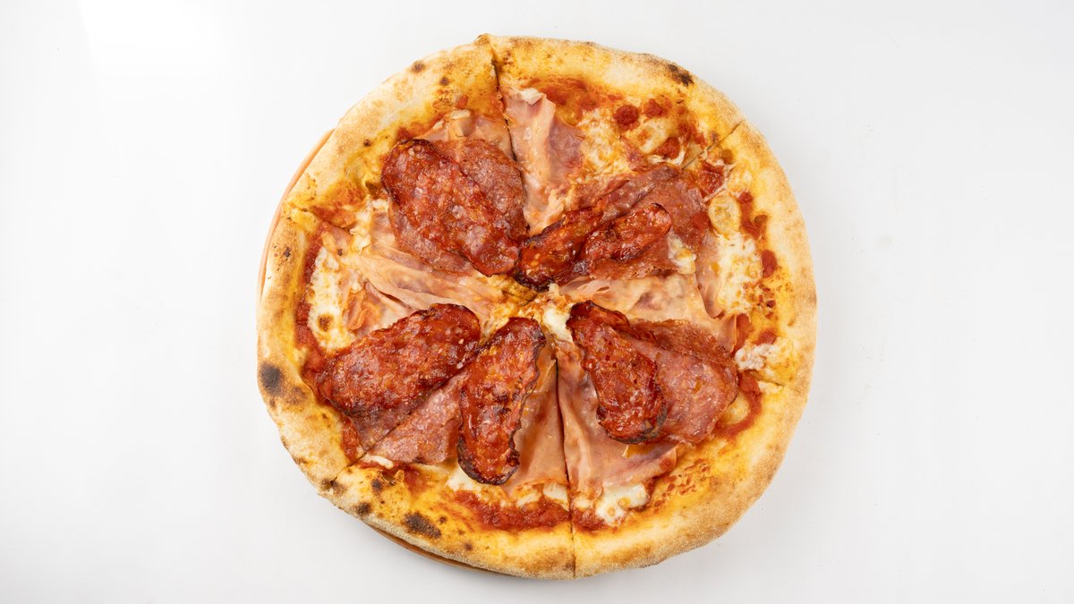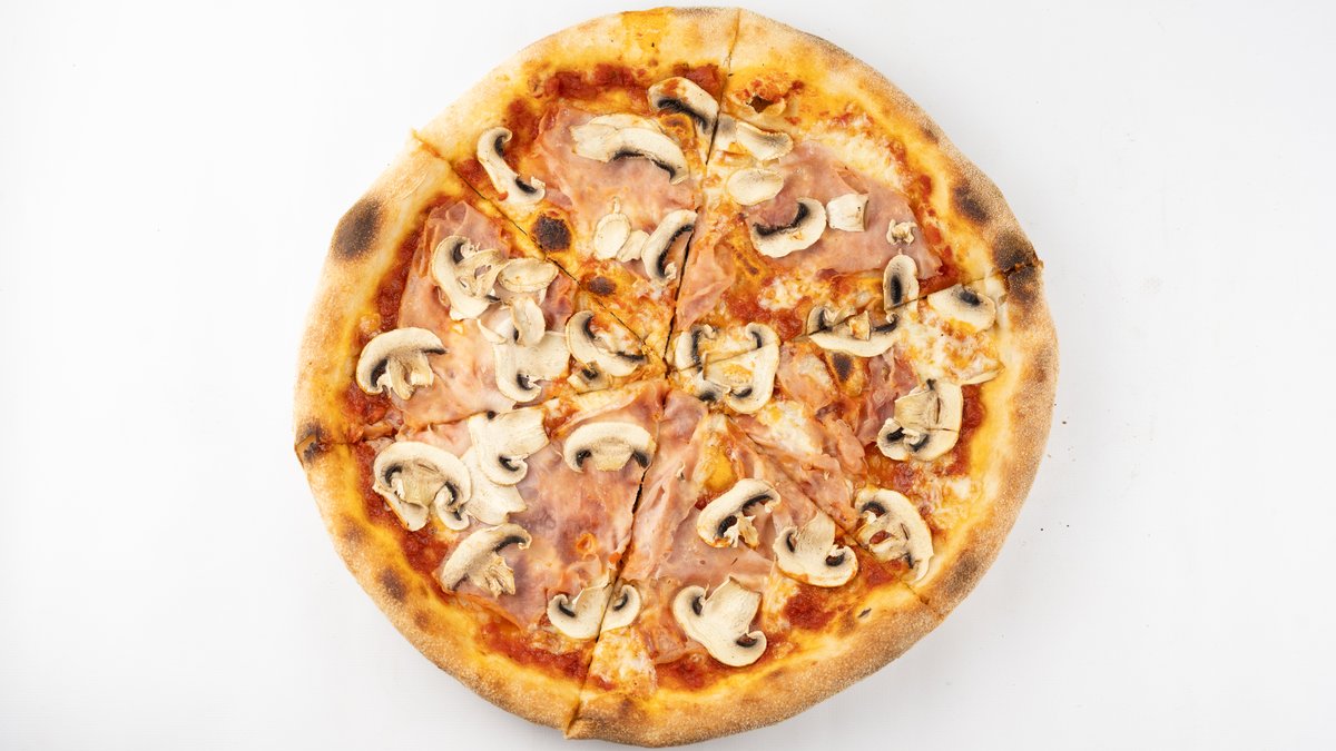 Sos z pomidorów san marzano, mozzarella fior di latte, prosciutto cotto, pieczarki